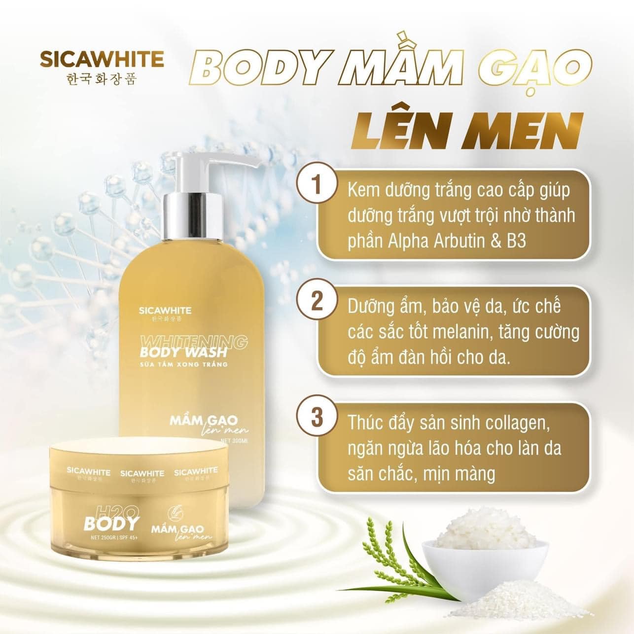 Với thành phần lành tính và hiệu quả, sản phẩm kem body mầm gạo H2O sẽ giúp tăng cường độ trắng cho làn da một cách tự nhiên và an toàn. Kem body mầm gạo chứa những thành phần như mầm gạo giàu dinh dưỡng và vitamin E, giúp tái tạo tế bào da, nuôi dưỡng và cung cấp độ ẩm tự nhiên cho làn da khô ráp.