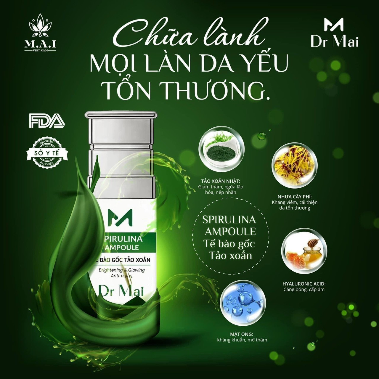 1.2. SPIRULINA AMPOULE: Thành phần chính tảo xoắn, chiết xuất cây phỉ, HA, Glutathione, dầu quả bơ,... giúp dưỡng da cao cấp, hỗ trợ giúp da trắng sáng, hỗ trợ làm mờ nếp nhăn và cấp ẩm da căng bóng. Đồng thời sản phẩm Tảo Dr Mai còn giúp ngăn ngừa mụn, mờ thâm, và giúp da khoẻ mạnh săn chắc.