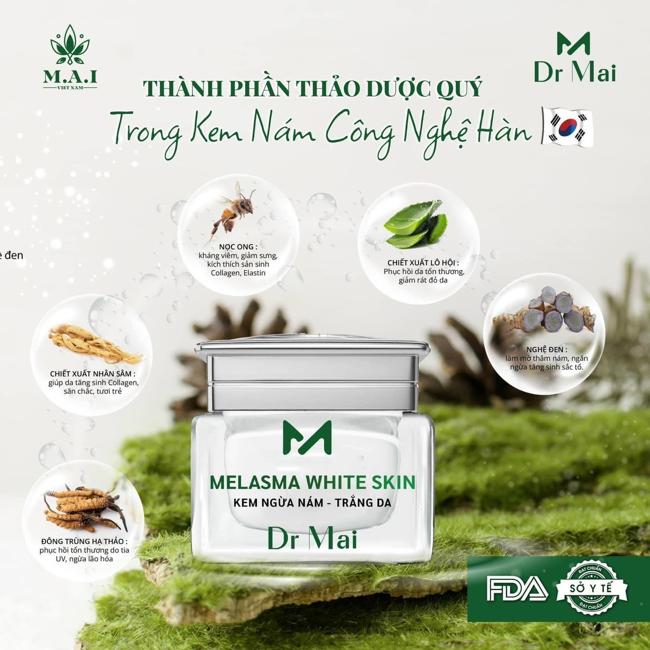 1.1. MELASMA WHITE SKIN: với 5 thành phần thảo dược quý và đắt đỏ đông trùng hạ thảo, nọc ong, nhân sâm, nghệ đen, lô hội tạo nên phiên bản hoàn hảo cho làn da trắng sáng, đánh bay sạm nám, tàn nhang và phục hồi làn da lão hoá. Từ đó, Dr Mai cải thiện làn da hỗ trợ sáng da, da không đều màu, giúp dày da, cho da khoẻ mạnh săn chắc.