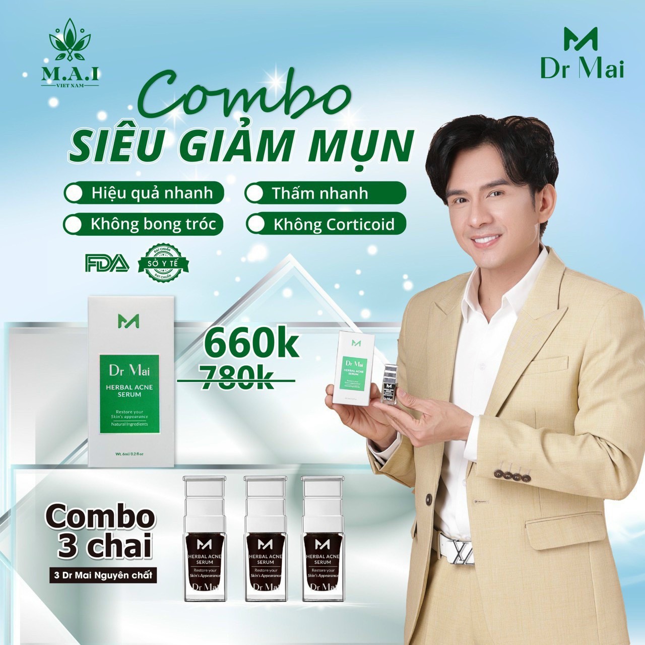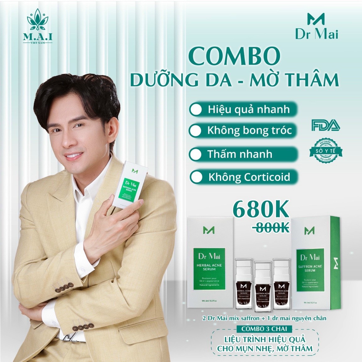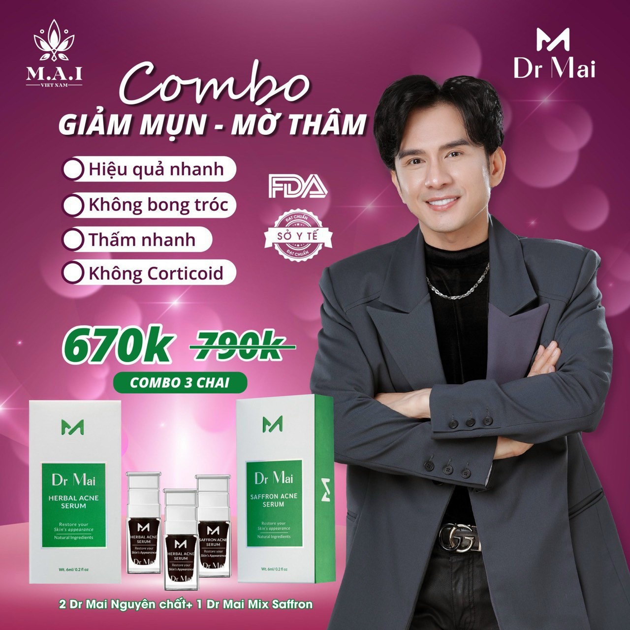 Combo Dr Mai giúp hiệu quả nhanh, thấm nhanh, không bong tróc, không Corticoid. Combo 3 chai Dr Mai Nguyên Chất giá 660k thích hợp cho da dầu và mụn nhiều, có thể mua thêm sũa rửa mặt Dr Mai để việc điều trị mụn đạt hiệu quả cao nhất.
