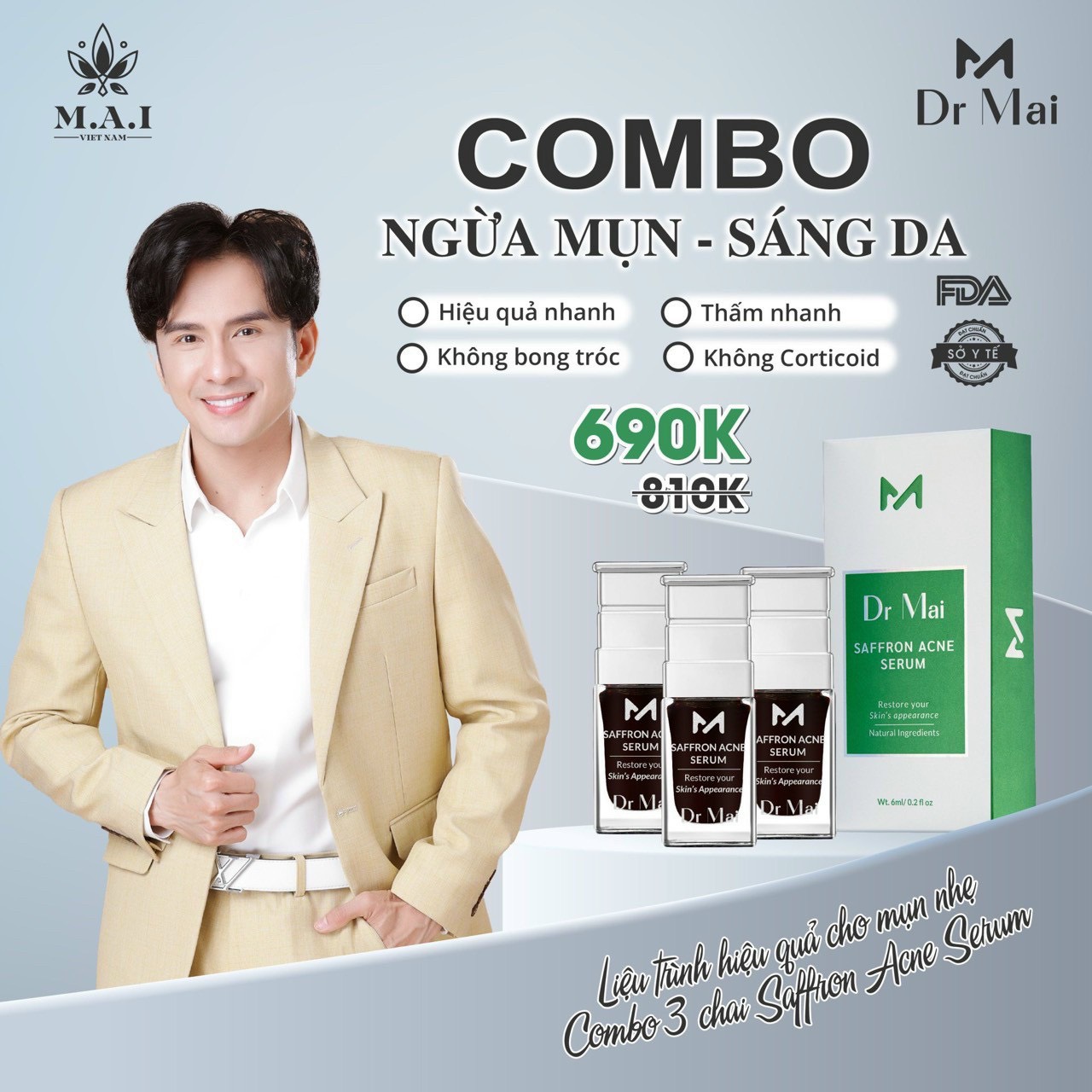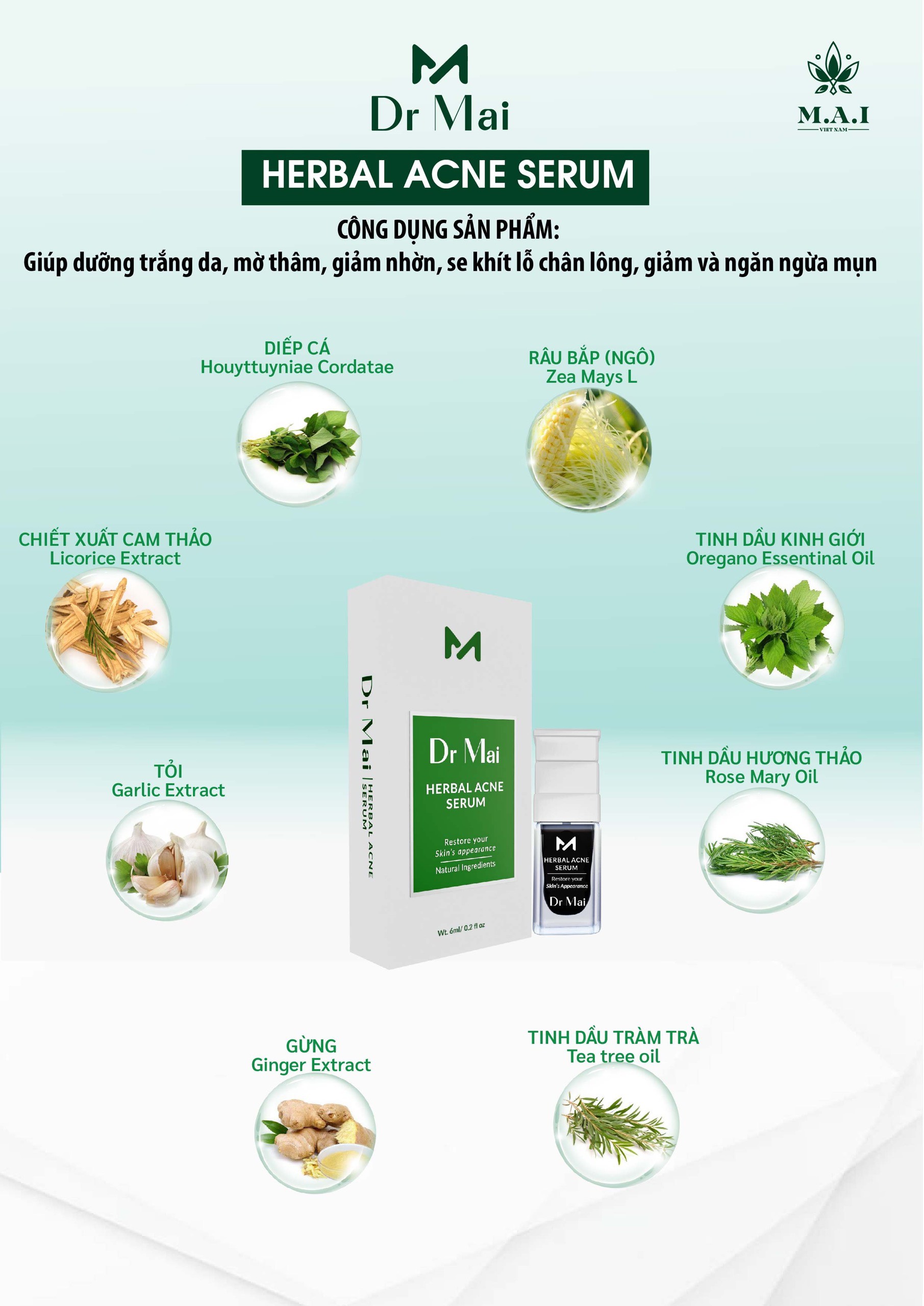 Serum Dr Mai chiết xuất từ thảo mộc từ thiên nhiên như: tinh dầu kinh giới, gừng, dầu tràm trà, hương thảo, nghệ, cam thảo, râu ngô, và rau diếp cá và có thêm Saffron cho Dr Mai mix Saffron. Dr Mai khẳng định uy tín với người tiêu dùng trong sướt hơn 4 năm qua, Dr Mai tự hào là sản phẩm Việt cho người Việt và được tin dùng trên khắp Việt Nam và lan toả ra nhiều quốc gia trên Thế Giới.