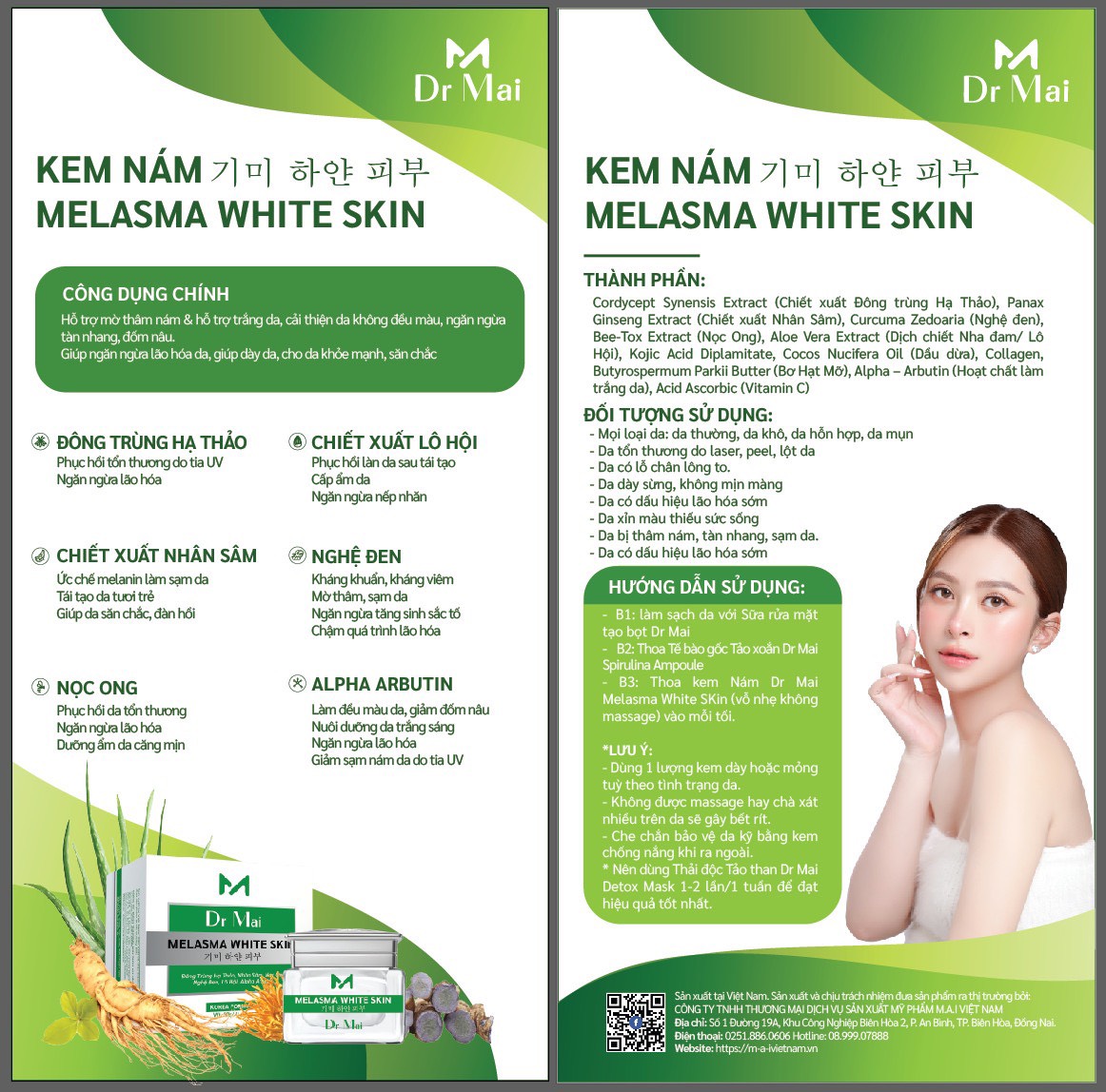 Kem Nám Dr Mai Melasma White Skin là dòng kem dưỡng trị nám từ Hàn Quốc: có tác dụng điều trị nám từ sâu bên trong, dưỡng trắng và se khít lỗ chân lông. Ngoài ra còn chứa các thành phần tự nhiên giúp cấp ẩm dưỡng trắng hiệu quả (cam kết trắng bật tone sau 1 tuần sử dụng)