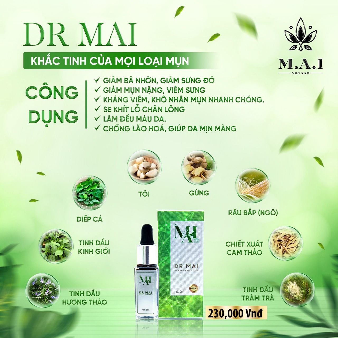 - Sử dụng serum trị mụn Dr Mai đặc trị cho mụn ẩn, Dr Mai trị mụn được chiết xuất từ thảo mộc thiên nhiên lành tính như: Diếp cá, kinh giới, hương thảo, tinh dầu tràm, rau bắp, quế, cam thảo, tỏi. Ngoài ra Dr Mai còn có inger extra, garlic extra, houttuyniae cordatae.zea mays L, oregano essential oil, rosemary oil, tea tree oil, licorice extract, nhụy hoa nghệ tây (saffron),…Hầu hết những thành phần trong sản phẩm Dr Mai này có tính kháng khuẩn rất cao. Giúp hỗ trợ điều trị các loại mụn: mụn ẩn, mụn bọc, mụn đầu đen, mụn cám, mụn mủ. Dr Mai kết hợp với nhiều hoạt chất giúp kháng viêm từ thiên nhiên. Đây đều là những tinh chất quý giá từ các loại thảo mộc tự nhiên, kết hợp lại thành một serum Dr Mai trị mụn an toàn và hiệu quả. Chính vì vậy Dr Mai giúp da của bạn trở nên hết mụn, trị thâm, tươi sáng, căng mịn và tràn đầy sức sống.