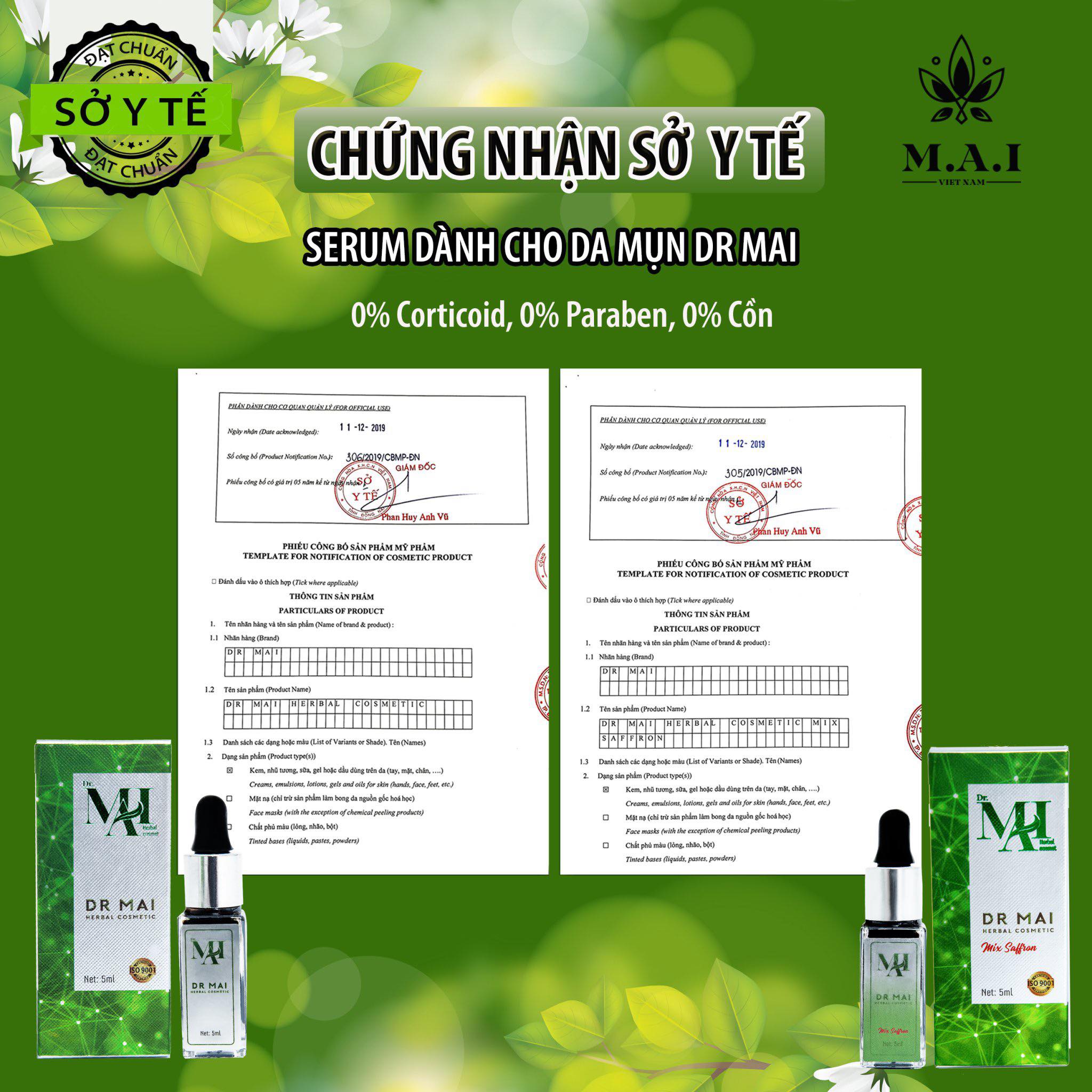 Dr Mai là sự kết hợp các loại thảo mộc thiên nhiên như: diếp cá, lá kinh giới, tinh dầu hương thảo, tinh dầu tràm, râu bắp, quế gừng, tỏi... hỗ trợ kiềm dầu, se khít, thu nhỏ lỗ chân lông; giúp làn da trắng sáng mịn màng, duyệt khuẩn mụn bọc, kháng viêm giảm sưng mụn mủ, loại bỏ mụn ẩn hiệu quả. Sản phẩm không gây bong tróc và mẫn cảm với da, có thể sử dụng cho mọi lứa tuổi, phù hợp với mọi loại da và cơ địa người Việt Nam. Serum Dr.Mai chuyên trị mụn đạt chứng nhận của sở Y Tế về độ an toàn sử dụng và được lưu hành trên toàn quốc.