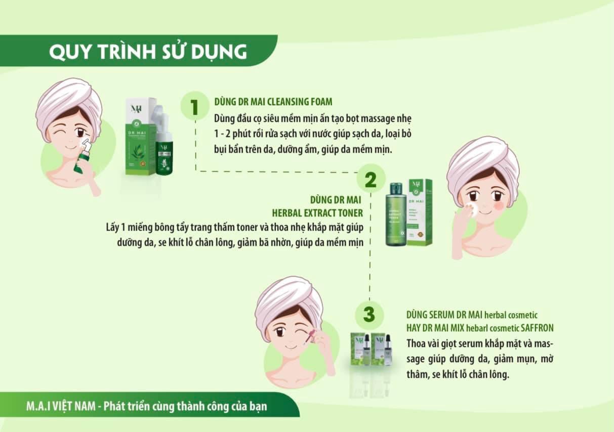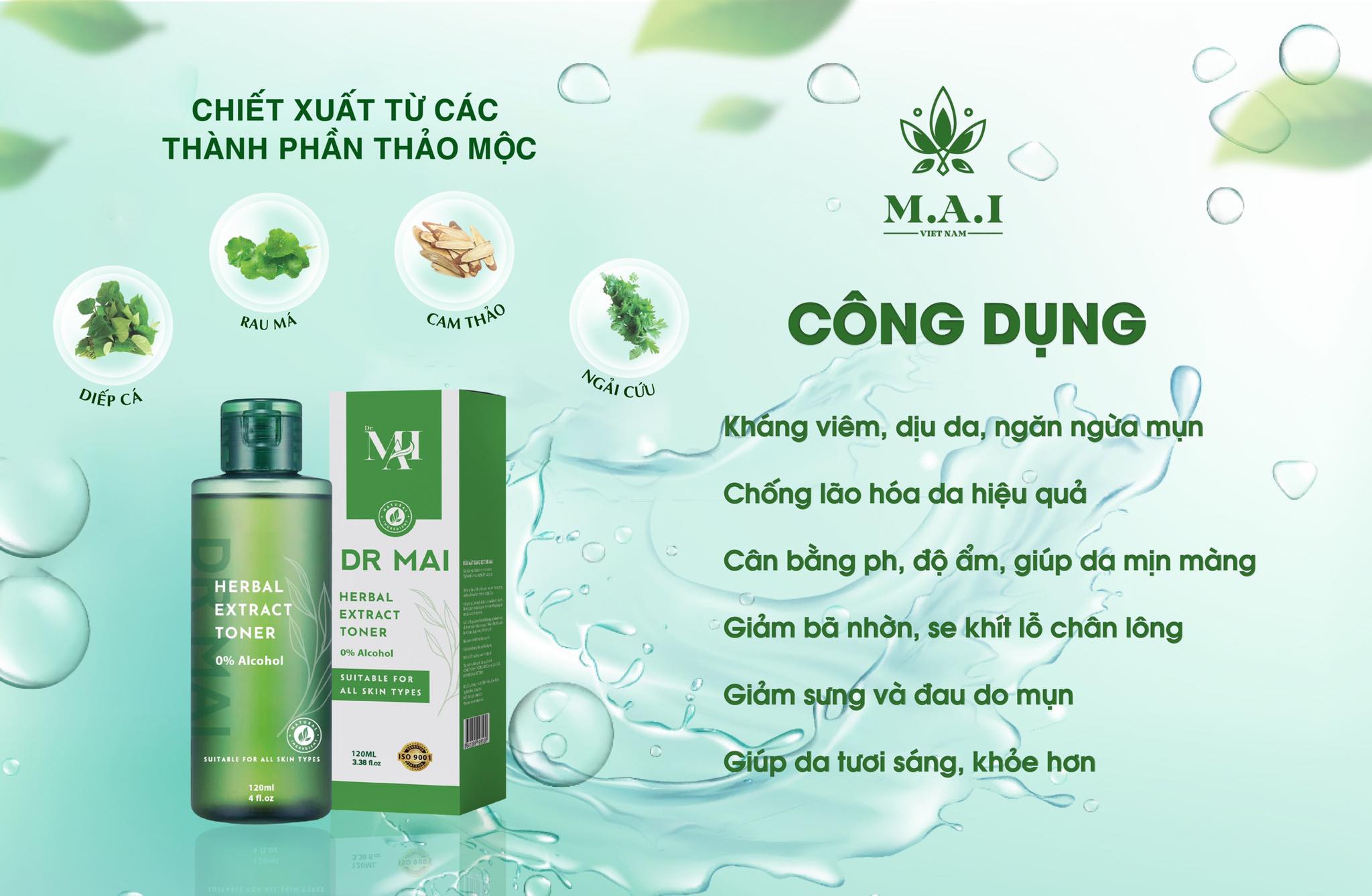 Cân bằng độ pH cho da bằng toner Dr Mai: Giúp ổn định môi trường da, tạo độ ẩm tránh cho da bị khô căng. Toner Dr Mai không cồn giúp làm giảm đi các sắc tố sậm màu, làm sạch da, loại bỏ tất cả các tạp chất bám sâu vào lỗ chân lông. Công dụng sản phẩm toner Dr Mai: Cân bằng độ PH cho da, làm mềm vùng da khô và kiểm soát lượng dầu thừa cho vùng da tiết nhiều dầu. Làm dịu vết cháy nắng, côn trùng cắn, đỏ mẩn, làm mềm các vùng da khô ráp trên toàn cơ thể. Đặc biệt da viêm mụn da xấu da lỗ chân to nên dùng toner Dr Mai để da hấp các tinh chất dưỡng nhanh và hiệu quả tốt nhất.