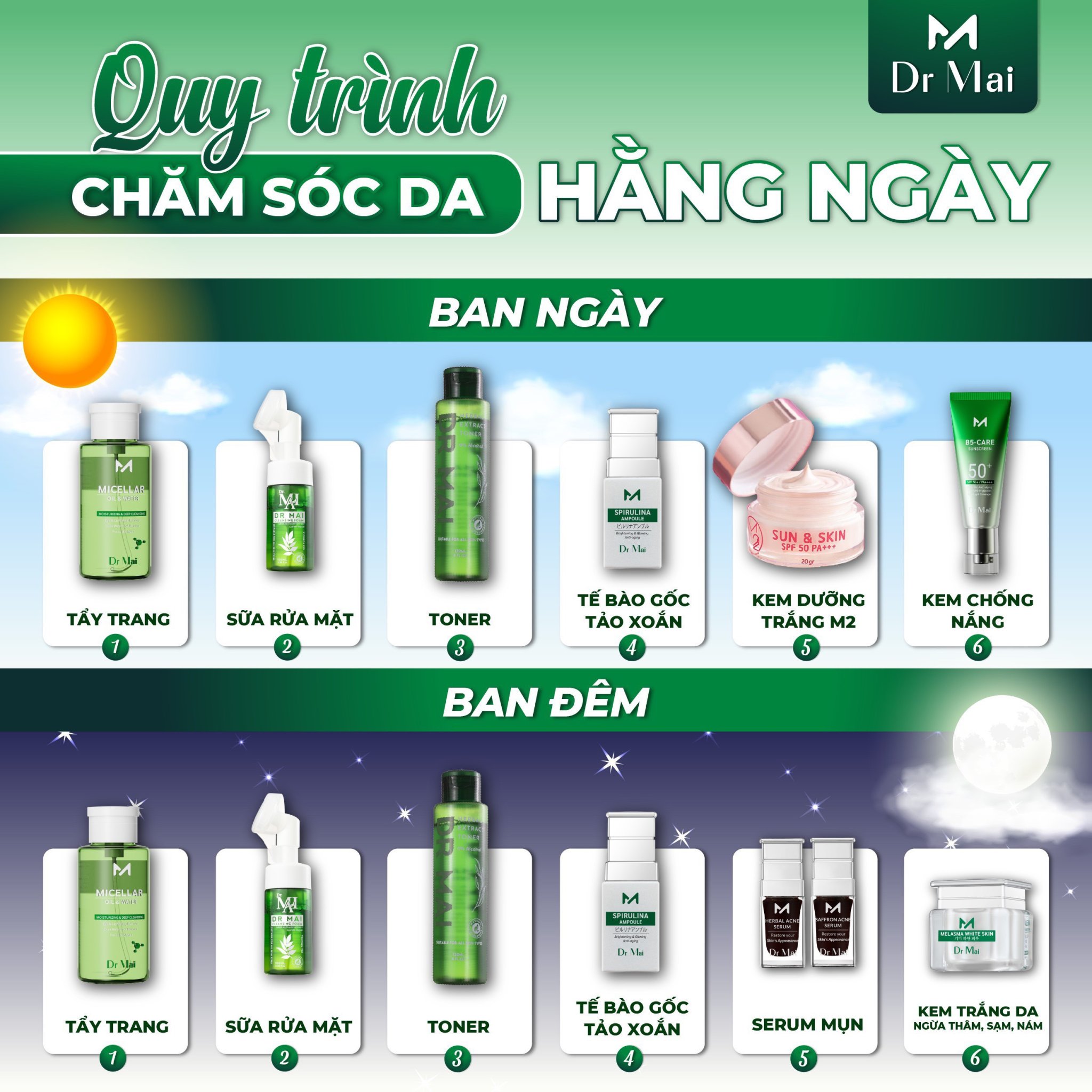 Chỉ loại bỏ mụn thôi là chưa đủ để có làn da đẹp, nhớ bổ sung các dưỡng chất cho da mỗi ngày. Trọn bộ sản phẩm Dr Mai cho hiệu quả nhanh mà không gây kích ứng nhờ bảng thành phần thiên nhiên an toàn.