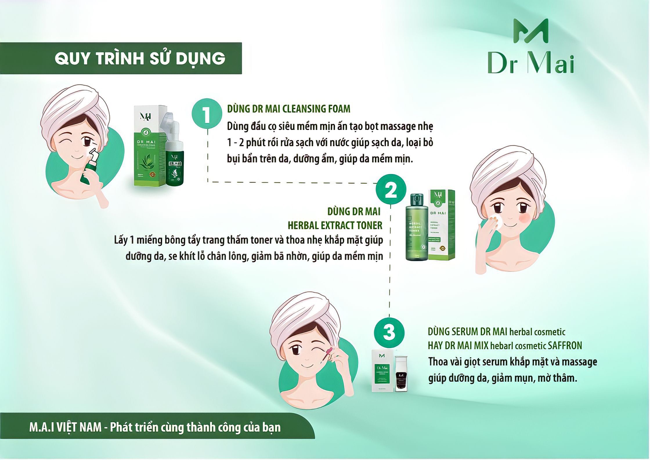 Hầu hết các chị em thường phải bôi rất nhiều lớp trên da trước khi ra ngoài, vừa gây bít tắc da vừa tốn thời gian. Đó cũng chính là nguyên nhân khiến da có thêm nhiều mụn. Vì vậy, Dr Mai Việt Nam đã có quy trình chuyên biệt, tối ưu dưới đây để các khách hàng tham khảo chăm sóc da hằng ngày.