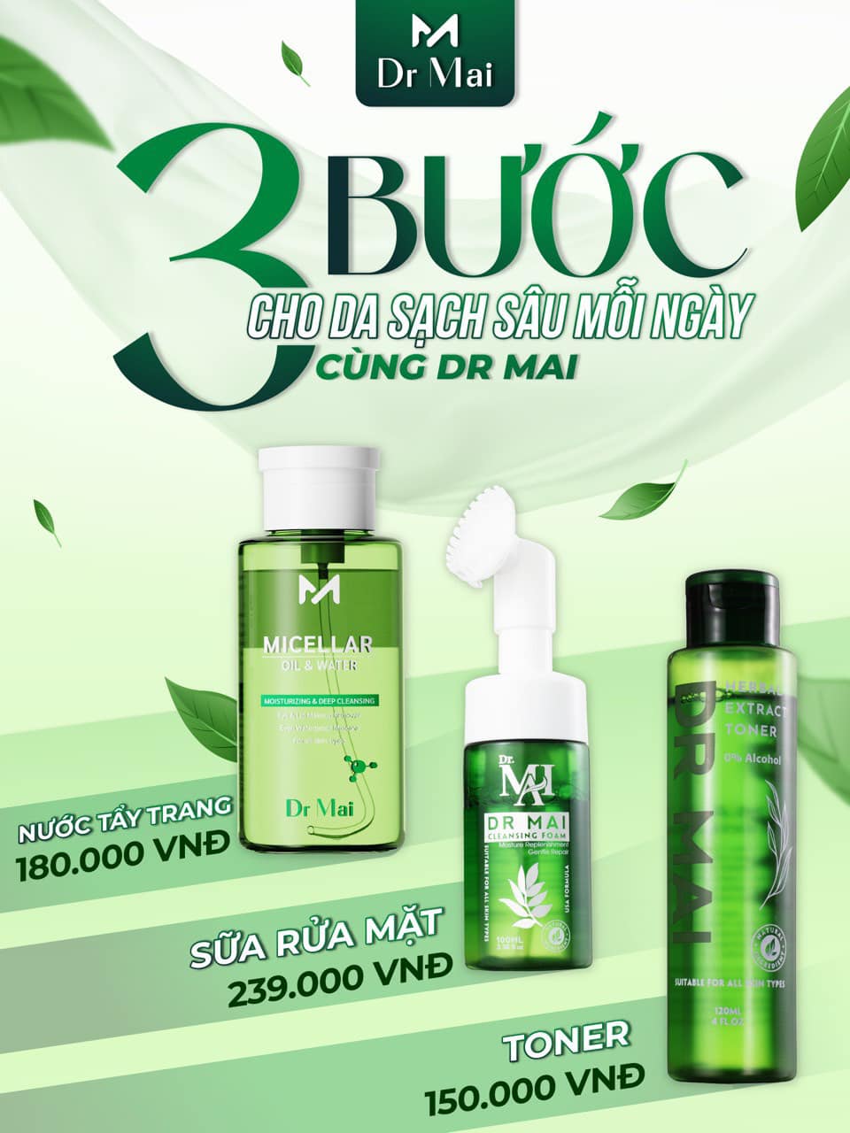Bộ sản phẩm Dr Mai gồm: Tẩy trang Dr Mai - Nước cân bằng da Toner Dr Mai - Thải độc tảo than Detox Dr Mai