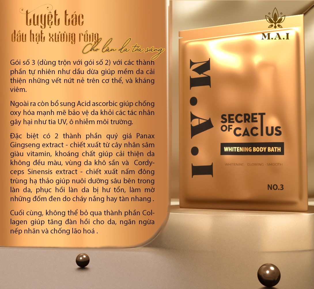 Tại Hàn Quốc cứ 10 phụ nữ được hỏi thì có đến 8 người chăm da cực tốt và dưỡng da rất sớm từ da mặt cho đến toàn thân để có được làn da căng mịn và bóng đẹp. Chăm sớm chăm muộn không bằng chăm luôn, chính vì vậy set tắm trắng Secret Of Cactus chuẩn Hàn của công ty M.A.I Việt Nam ra đời. Set tắm trắng Secret Of Cactus giúp da body bật 2 tông sau 1 lần sử dụng, set tắm với thành phần được chiết xuất từ Dầu hạt xương rồng với hàm lượng vitamin E chống lão hoá gấp 150% dầu Argan.