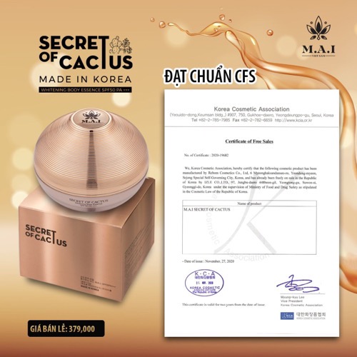 Đặc biệt, sản phẩm Secret Of Cactus đạt tiêu chuẩn CFS được cấp bởi Korea Cosmetic Association (Hiệp hội Mỹ Phẩm Hàn Quốc)