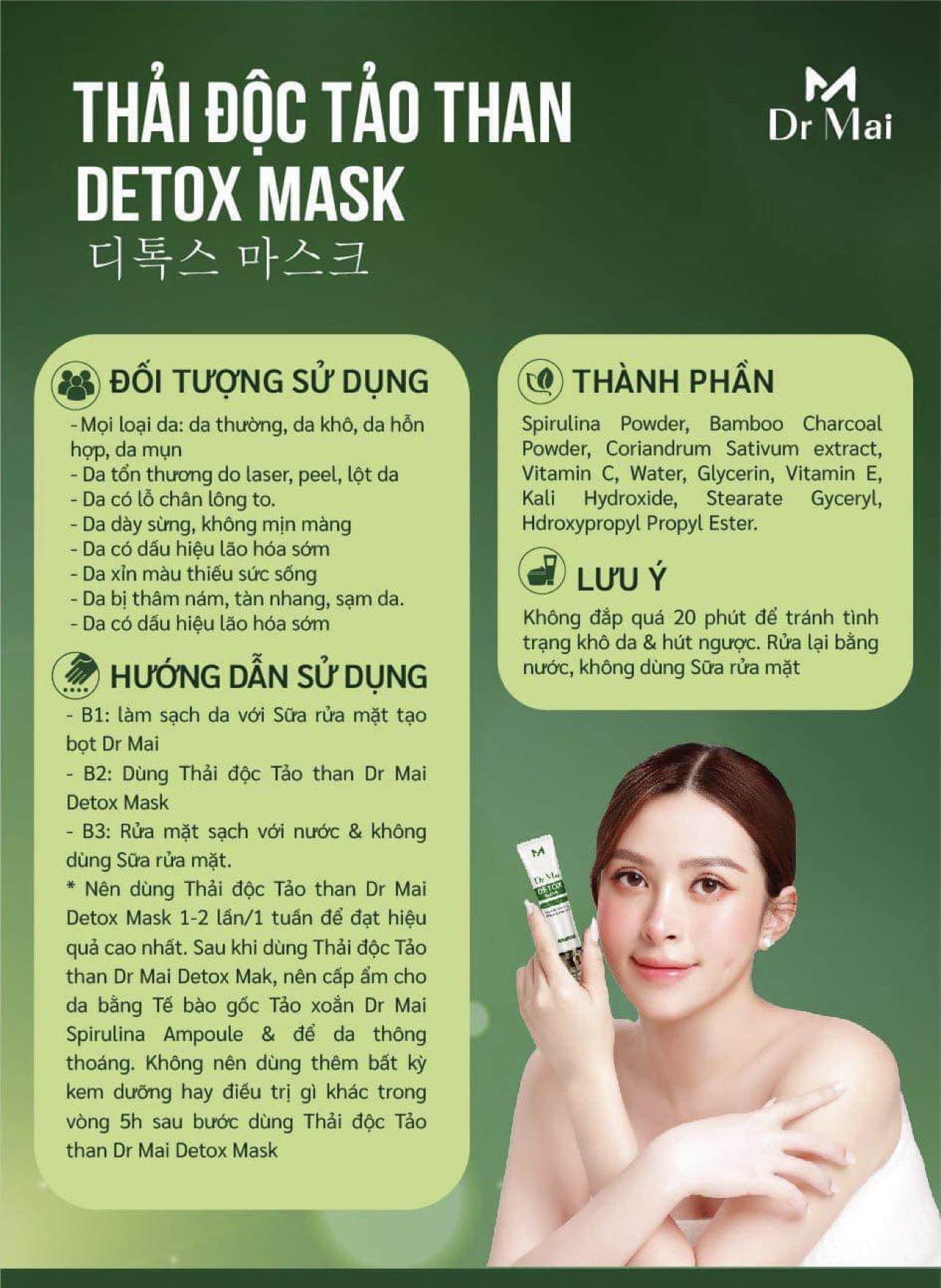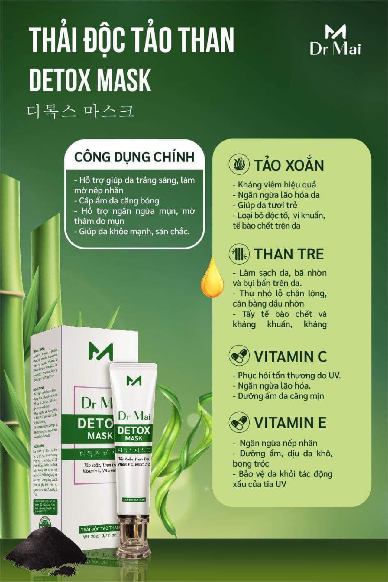 Detox Mask tảo than Dr Mai được biết đến hàng đầu với công dụng thải độc vô cùng xịn sò luôn đó mấy chị, vừa làm sạch da mà còn có nhiều công dụng khác như: đào thải các độc tố corticoid, làm sạch các vi khuẩn, bụi bẩn & cặn kem cũ... tích tụ từ sâu bên trong da mặt, thải độc da, điều tiết tình trạng dầu nhờn, cải thiện các vết viêm mụn, cấp ẩm, phục hồi làn da bị hư tổn, se khít lỗ chân lông, làm đều màu da, trắng sáng, giúp da khỏe mạnh từ sâu bên trong