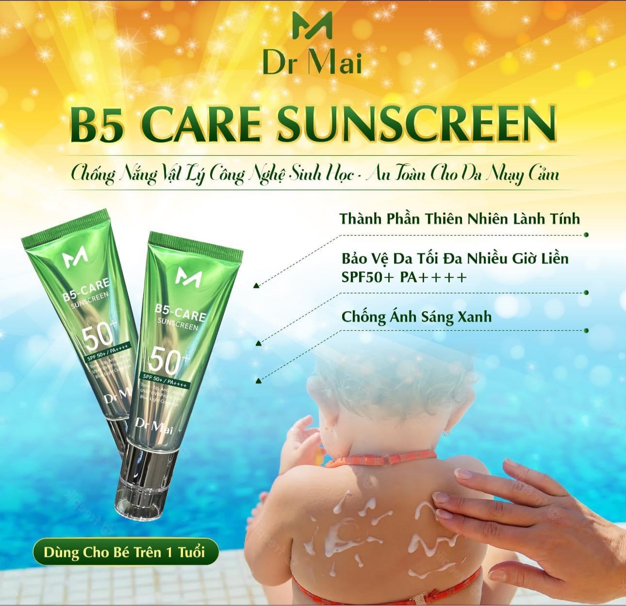 - Kem chống nắng Dr Mai - B5 Care Suncreen với chiết xuất thiên nhiên rất an toàn cho da, giúp vừa chống nắng, vừa dưỡng da đẹp hơn từng ngày, là điều mà ít loại kem chống nắng nào làm được.