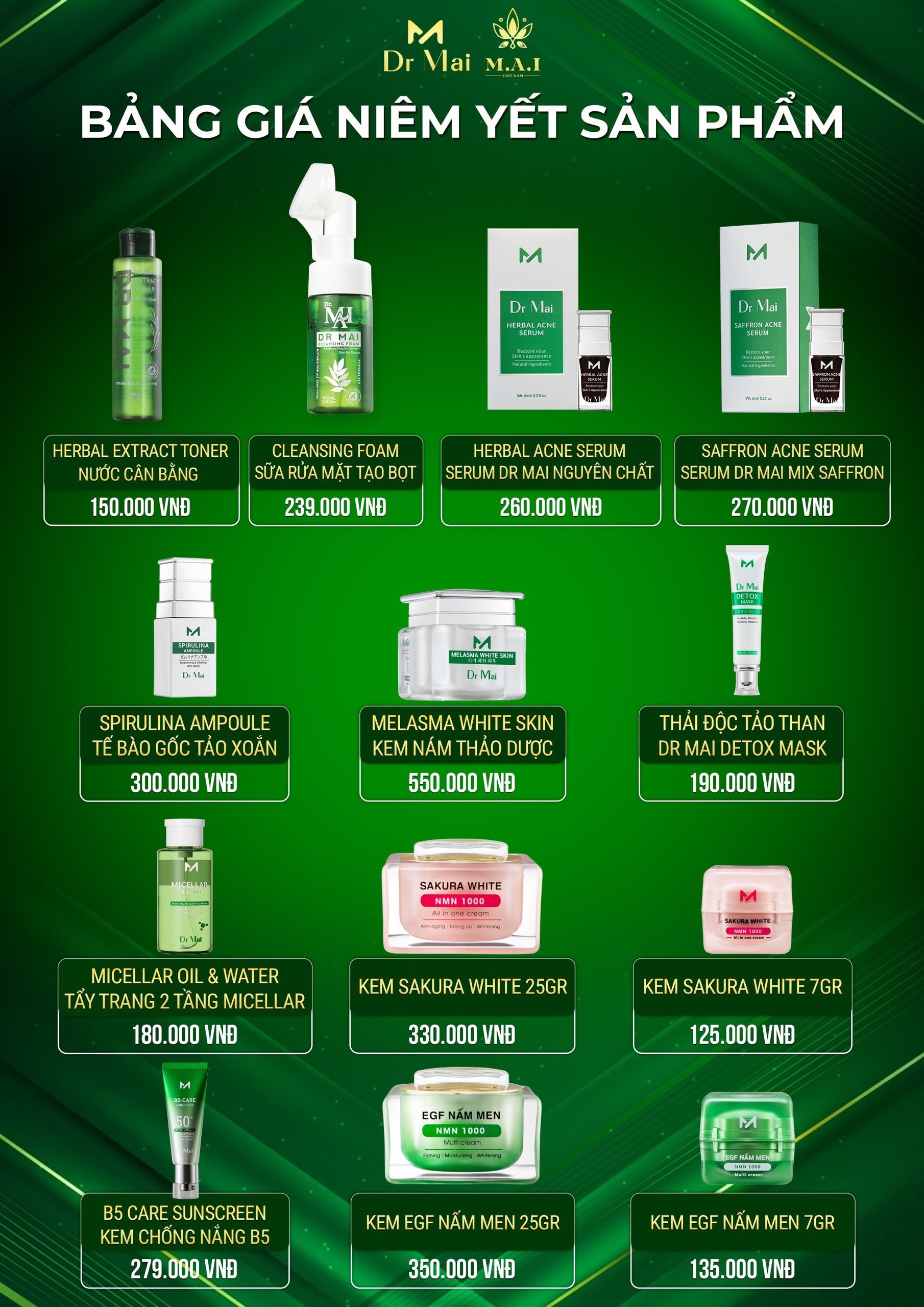 Thuốc trị mụn Dr Mai là sản phẩm chủ lực của công ty M.A.I Việt Nam, có giá thành niêm yết rất phù hợp và tiết kiệm để điều trị mụn hiệu quả tại nhà. Hãy là khách hàng thông thái để tránh mua phải hàng kém chất lượng ảnh hưởng đến làn da nhạy cảm và có khả năng phá hủy trực tiếp làn da, vốn đang tổn thương do mụn!!!