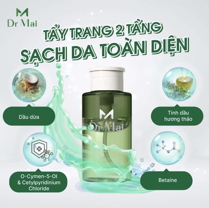 - Tẩy trang Dr Mai Micellar là tẩy trang 2 tầng kết hợp giữa nước và dầu nên có thể dùng được cho cả da khô, hỗn hợp và da dầu.