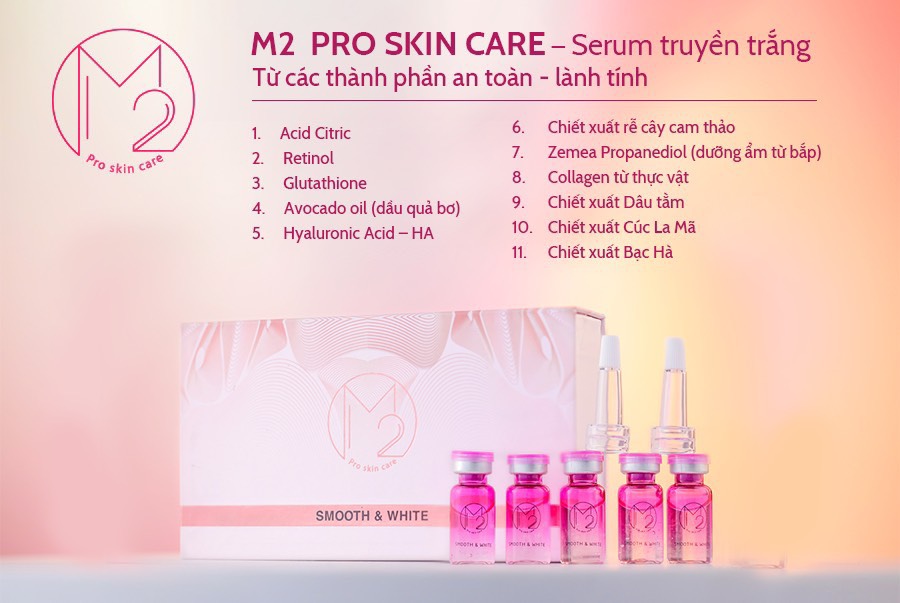 Trên thị trường có rất nhiều loại Serum với nhiều cộng dụng khác nhau. Nhưng M2 serum smooth & white vẫn có chỗ đứng riêng trong lòng các chị em phái đẹp bởi công dụng tuyệt vời của M2, với thành phần chính từ 𝑮𝑳𝑼𝑻𝑨𝑻𝑯𝑰𝑶𝑵𝑬 , 𝑪𝑶𝑳𝑳𝑨𝑮𝑬𝑵 giúp tăng cường dưỡng trắng tối ưu, ngừa thâm nám, giúp da ngậm nước cả ngày, chống lão hoá cho da, nâng dần tông da trong 30 ngày, se khít lỗ chân lông, da sáng mịn.