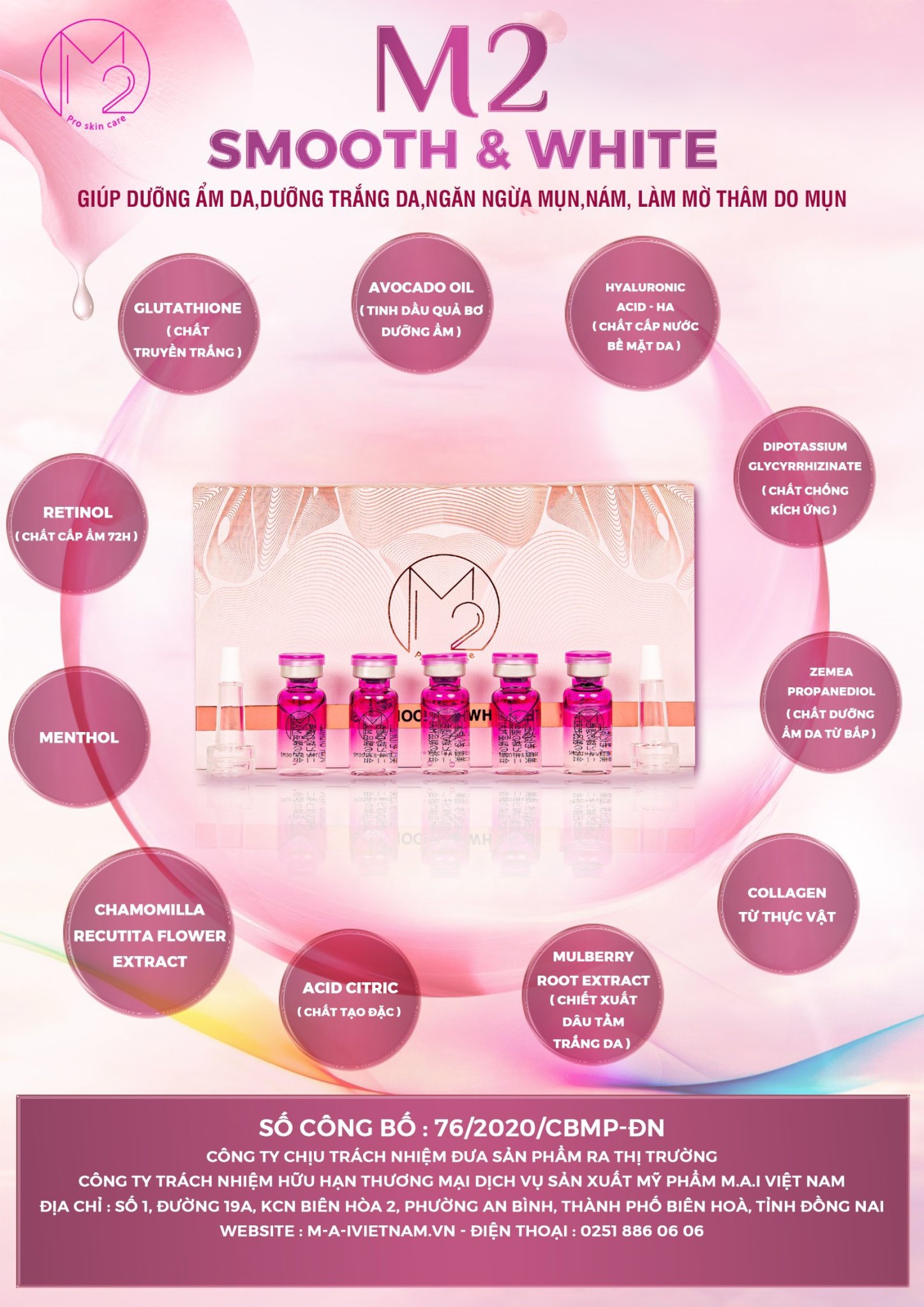 - Dưỡng ẩm trắng da cùng serum truyền trắng M2 Smooth & White giúp ngăn ngừa lão hoá, tăng độ đàn hồi, chống viêm da, làm dịu da.