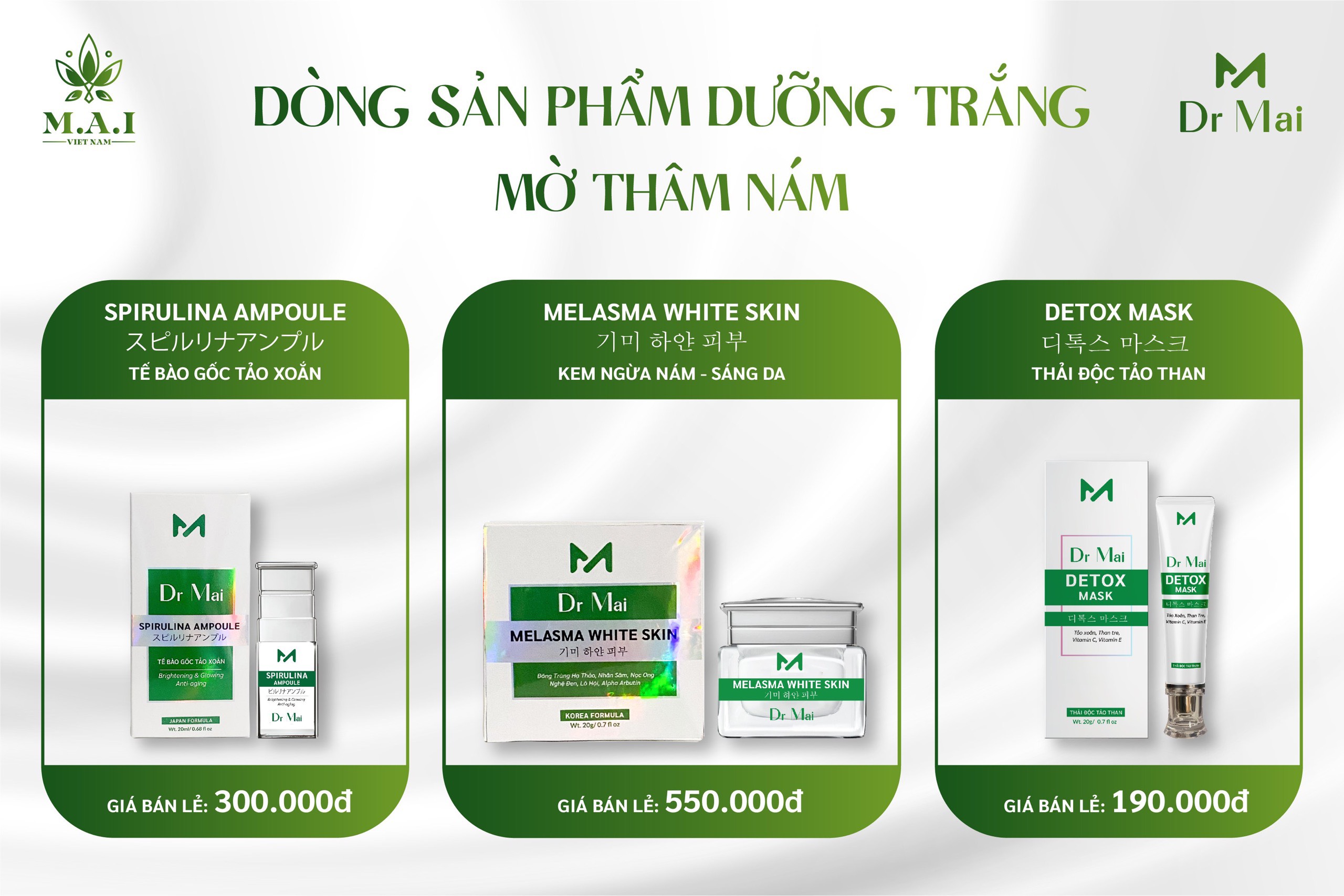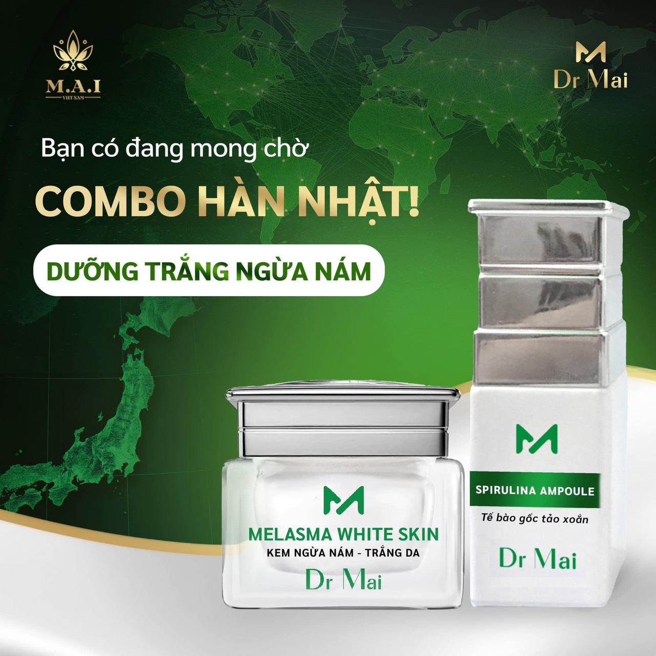 Nhờ hiểu được sự lo lắng của chị em, M.A.I VIỆT NAM đã cho ra mắt các dòng sản phẩm combo trắng da ngừa Nám Dr Mai Melasma White Skin & Tế Bào Gốc Tảo Xoắn Dr Mai Spirulina Ampoule giúp chị em đầy lùi nám và làm mờ hiệu quả. Từ đó bái bai làn bị khuyết điểm do thời gian, do ảnh hưởng của môi trường và da bị các nốt mụn, sần sùi “da gà”, giúp cải thiện tình trạng viêm nang lông nữa đó nhé. Dr mai Melasma White Skin và tế bào gốc tảo xoắn Dr Mai Spirulina Ampoule là dòng sản phẩm dưỡng trắng mờ thâm nám “ĐÁNH THỨC VẺ ĐẸP” của mọi làn da giúp nuôi dưỡng làn da mềm mịn, trẻ hoá, trắng sáng, căng bóng, nám sạm mờ dần và làn da ngày càng khoẻ đẹp hơn.